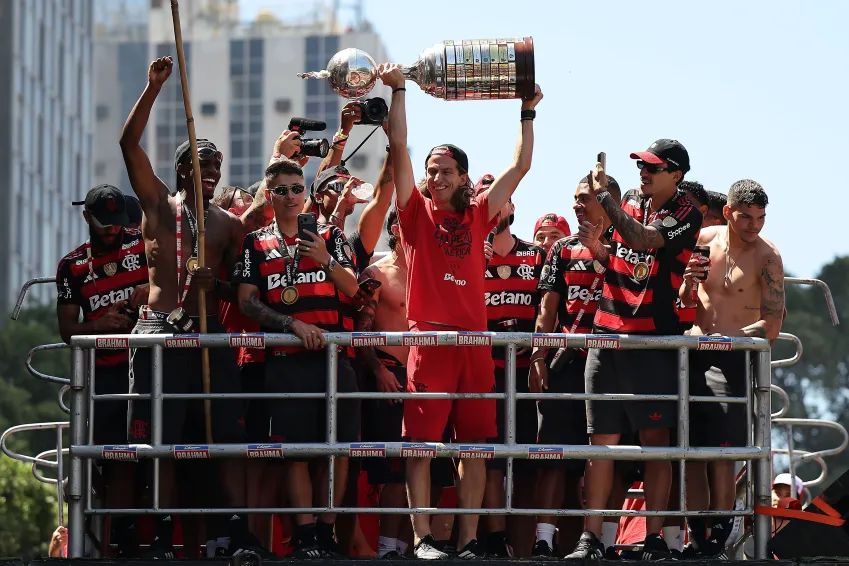 A festa do Flamengo com a torcida no Rio de Janeiro contou com um momento inusitado: a taça da Copa Libertadores apareceu com um remendo na sua parte superior. Nas imagens exibidas pelo Sportv, é possível ver que o topo do troféu — onde fica a pequena escultura de um jogador chutando a bola — estava envolto em uma proteção semelhante a fita crepe.